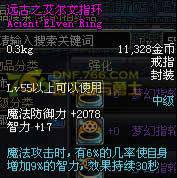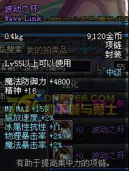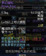 Lv55以上可以使用 魔法防御力+2075 智力+18 魔法攻击时,有6%的几率使自身增加9%的智力 持续30秒 (法系神器戒指之一,高几率触发,而且是魔攻触发,拉罗是物攻触发)