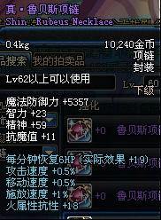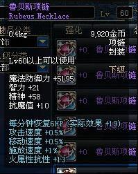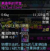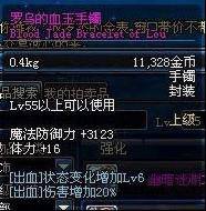 Lv55以上可以使用 魔法防御力+5200 精神+19 物理攻击时,有5%的几率使自身增加11%的力量 持续30秒 (不说了,也算超神器项链了,而且这个还不止11%)