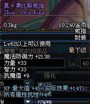 Lv62以上可以使用 魔法防御力+2138 力量+33 智力+33 抗魔值+9 HP最大值+45(实际效果+147) 所有属性抗性+4 |