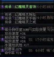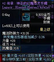Lv60以上可以使用 传承:神圣的幻魔精灵胸坠 传承:神圣的幻魔精灵手镯 传承:神圣的幻魔精灵戒指 每分钟恢复33MP(实际效果+138) 攻击速度+3.5% 移动速度+3.5% 施放速度+6% 暗属性抗性+12 回避率+2.5% 命中率+1%