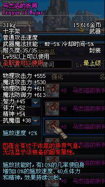 Lv55以上可以使用 物理攻击+500 魔法攻击+610 智力+44 释放速度+2% 光属性强化+15 念气波伤害+15% 念气波有10%的几率使敌人中毒。