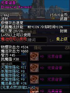 Lv55以上可以使用 物理攻击505+ 魔法攻击647+ 智力45+ 魔法暴击率+3% 元素点燃Lv+2 火属性强化10+ 暗属性强化10+ 冰属性强化10+ 光属性强化10+