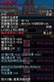 Lv55以上可以使用 物理防御力+668 魔法攻击力+493 力量+65 抗魔值+38 命中率+1% 地狱摇篮LV+1 裂石破天LV+1 背击攻击力+20%
