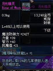 Lv65以上可以使用 魔法防御力+2427 力量+39 智力+40 抗魔值+21 (暗月降临)技能Lv+1 攻击时,有10%的几率使敌人进入失明状态。