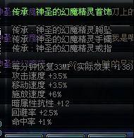 Lv60以上可以使用 传承:神圣的幻魔精灵胸坠 传承:神圣的幻魔精灵手镯 传承:神圣的幻魔精灵戒指 每分钟恢复33MP(实际效果+138) 攻击速度+3.5% 移动速度+3.5% 施放速度+6% 暗属性抗性+12 回避率+2.5% 命中率+1%