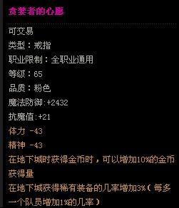 Lv65以上可以使用 魔法防御力+6075 智力+26 精神+67 抗魔值+23 攻击速度+3% 地下城内攻击速度+10%