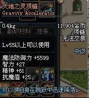 Lv55以上可以使用 魔法防御力+5599 智力+27 精神+61 抗魔值+25 可以使自身在跳跃中迅速降落 |