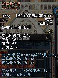 Lv55以上可以使用 魔法防御力+2245 力量+39 智力+40 抗魔值+22 每分钟恢复31.2HP(实际效果+102) 物理独立攻击力+42 魔法独立攻击力+42 在决斗场中,物理和魔法的独立攻击力会有所调整 |