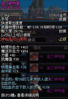 Lv55以上可以使用 物理攻击445+ 魔法攻击485+ 力量41+ 物理暴击+10% 近战伤害+20%