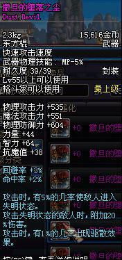 Lv55以上可以使用 物理攻击530+ 魔法攻击530+ 回避率+3% 命中率+2% 力量+44 智力+64 抗魔值+38 攻击时,有5%的几率使人进入失明状态。 攻击失明状态敌人时,附加20%伤害。 攻击时,有1%的几率出现驱散效果。