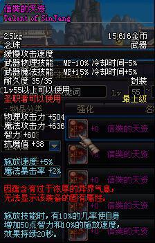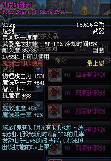 Lv55以上可以使用 物理攻击510+ 魔法攻击620+ 智力44+ 释放速度+5% 魔法暴击+2% 施放鬼斩,月光斩,地裂波动剑,邪光斩时,有50%的几率该技能Lv+5。