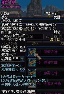 Lv55以上可以使用 物理攻击+500 魔法攻击+610 智力+44 释放速度+2% 光属性强化+15 念气波伤害+15% 念气波有10%的几率使敌人中毒。