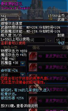 Lv55以上可以使用 物理防御力+668 魔法攻击力+493 力量+65 抗魔值+38 命中率+1% 地狱摇篮LV+1 裂石破天LV+1 背击攻击力+20%
