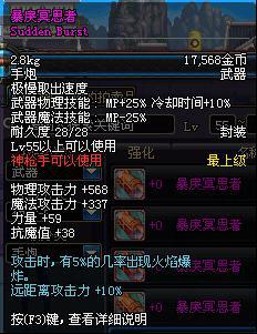 Lv55以上可以使用 物理攻击545+ 魔法攻击335+ 力量59+ 攻击时,有5%几率出现火焰爆炸。 远程伤害+10%