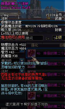 Lv55以上可以使用 物理攻击522+ 魔法攻击664+ 智力43+ 穿戴时,可以使300PX范围的队员增加30智力 释放时,有4%几率召唤出琳恩,并使其释放湮灭黑洞(PK场无效) |
